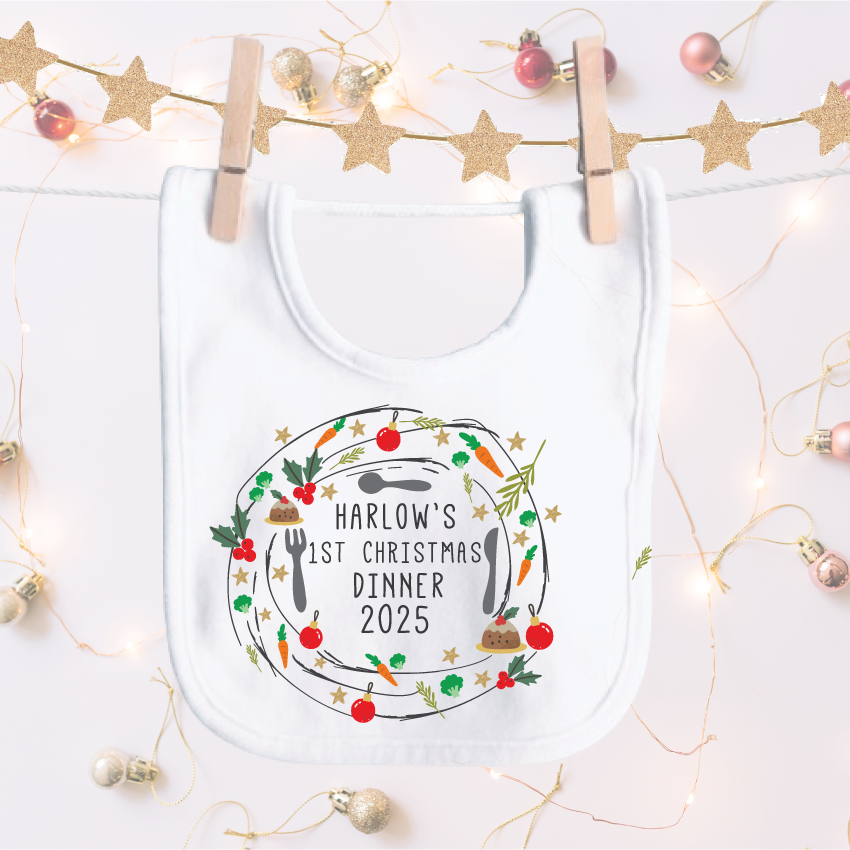 Celebrate your little one’s magical first Christmas with this beautifully Personalised 1st Christmas Dinner Bib.