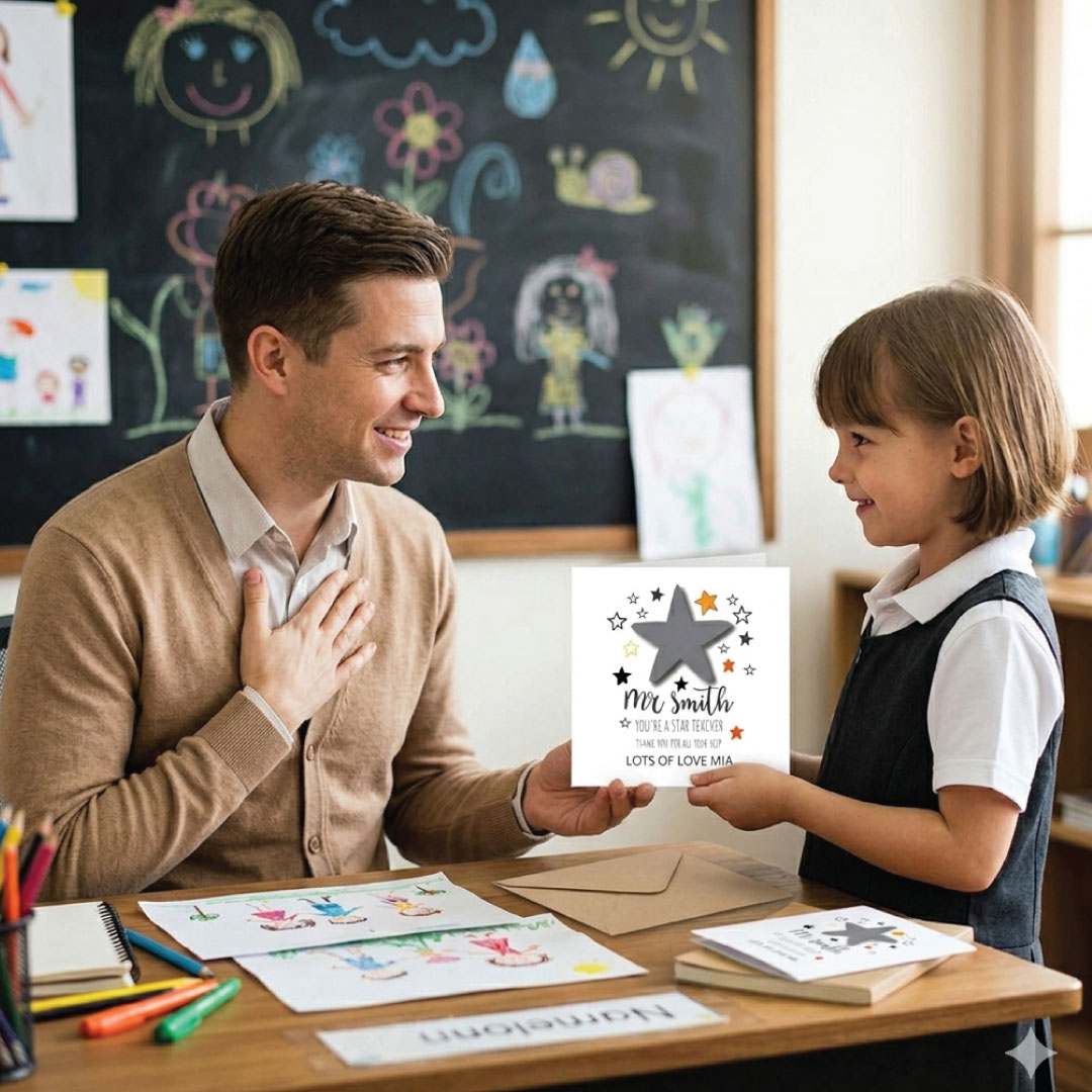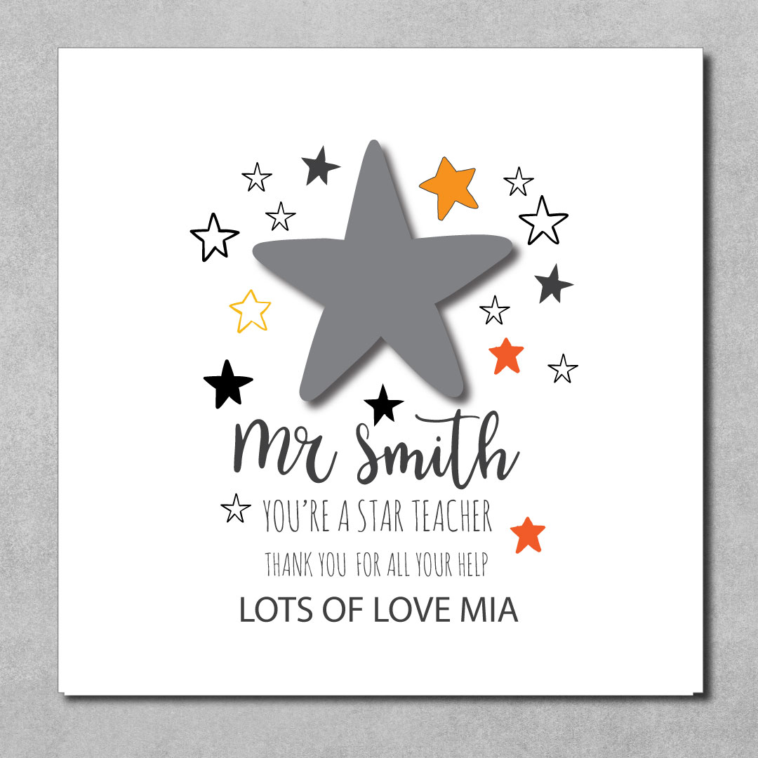 Customised with the teacher’s name (e.g. Mr Smith), the message “You’re a star teacher” is elegantly displayed in a stylish handwritten font, paired with a heartfelt thank-you note beneath. The mix of script and clean typography creates a contemporary yet warm aesthetic, perfect for showing genuine appreciation.