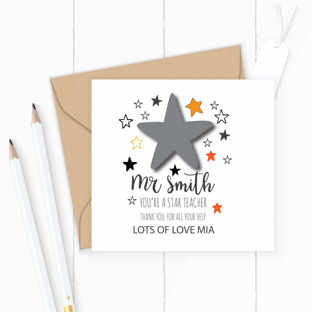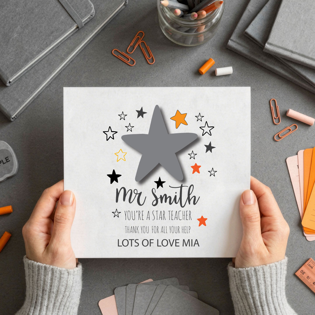 A personalised “Star Teacher” thank-you card featuring a stylish star design and custom name.